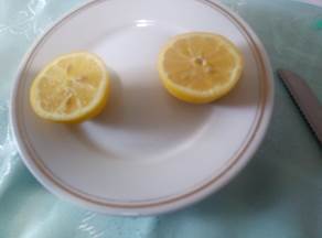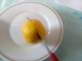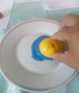 Ставете боја по избор во еден сад, овошјето кое ќе ви послужи за печат исечете го на пола.Едната половина од овошјето се става во боја и внимателно се печати на бел лист хартија повеќе пати, секој пат се добива интересна форма(отисок)